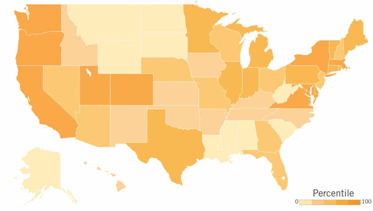 The five top-ranked states on these indicators are Massachusetts, Washington, Maryland, California, and Delaware. The report finds they are thriving hubs of data-driven innovation and shows that a sustained commitment from policymakers to supporting the data economy pays dividends. Some states benefit from certain characteristics that make them well-positioned to take advantage of data-driven innovation, such as being home to many universities. However, leading states have all taken proactive steps to unlock innovation, like supporting STEM in public schools, investing in e-government, implementing robust open-data policies, and promoting the deployment of health information technology.